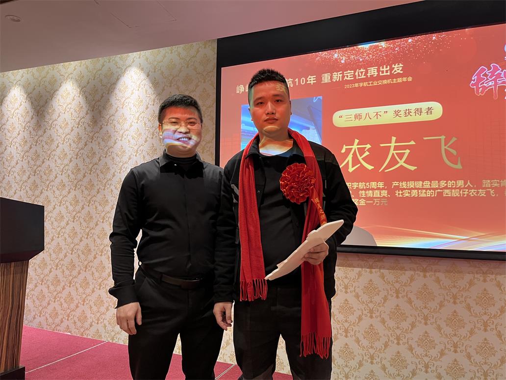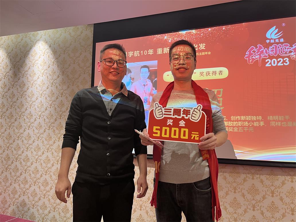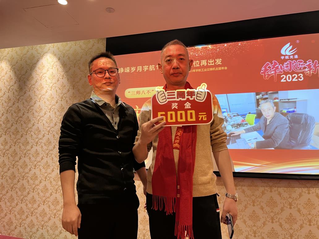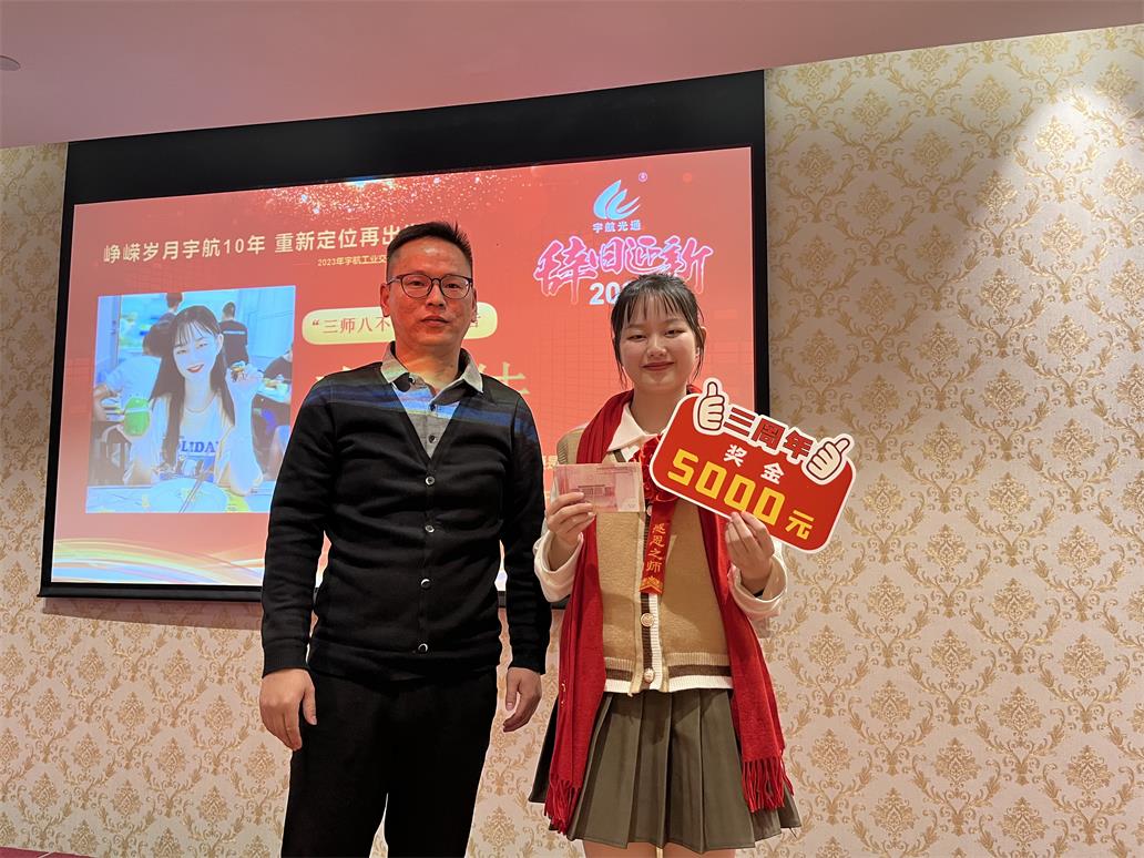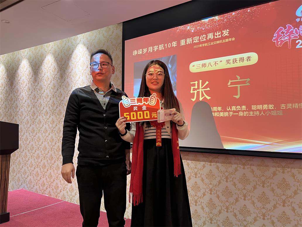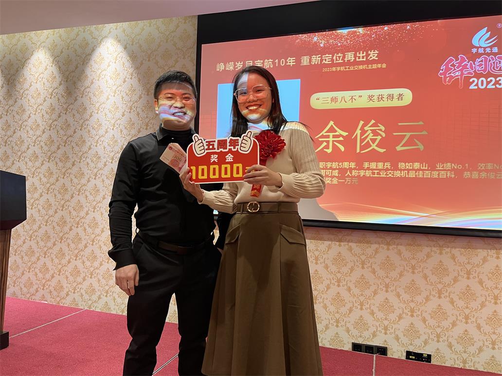余俊云—入職宇航五周年獎,獎勵現金一萬元。手握重兵,穩如泰山,業績No.1,效率No.1,可甜可咸,人稱宇航工業交換機最佳百度百科。