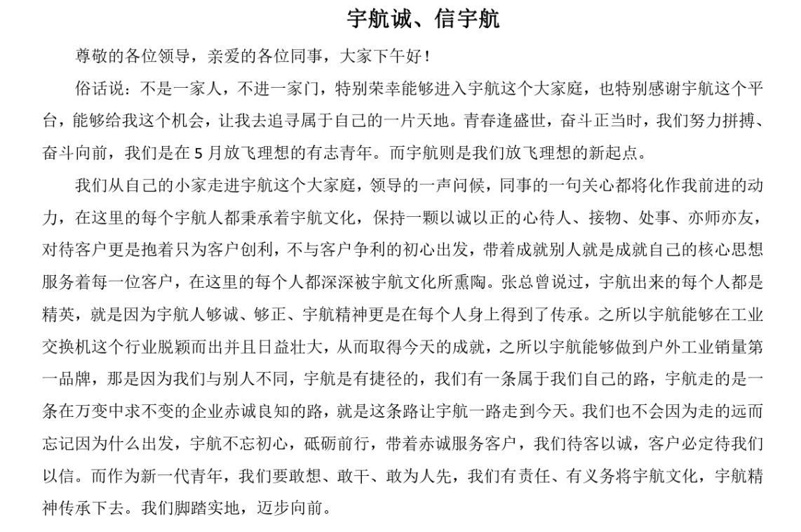 近期,宇航工業交換機在全國各地的展會正如火如荼地進行,因此,有幾個同事因參展未能參加此次比賽。其中,宇航工業交換機旗下子公司子品牌北土工業參賽選手“孫全龍”的演講稿,被評為最佳演講稿。宇航工業交換機總設計師張總對此演講稿給予了高度的肯定,也向在座所有人傳遞了主動、激情、真誠、用心”的做事態度。