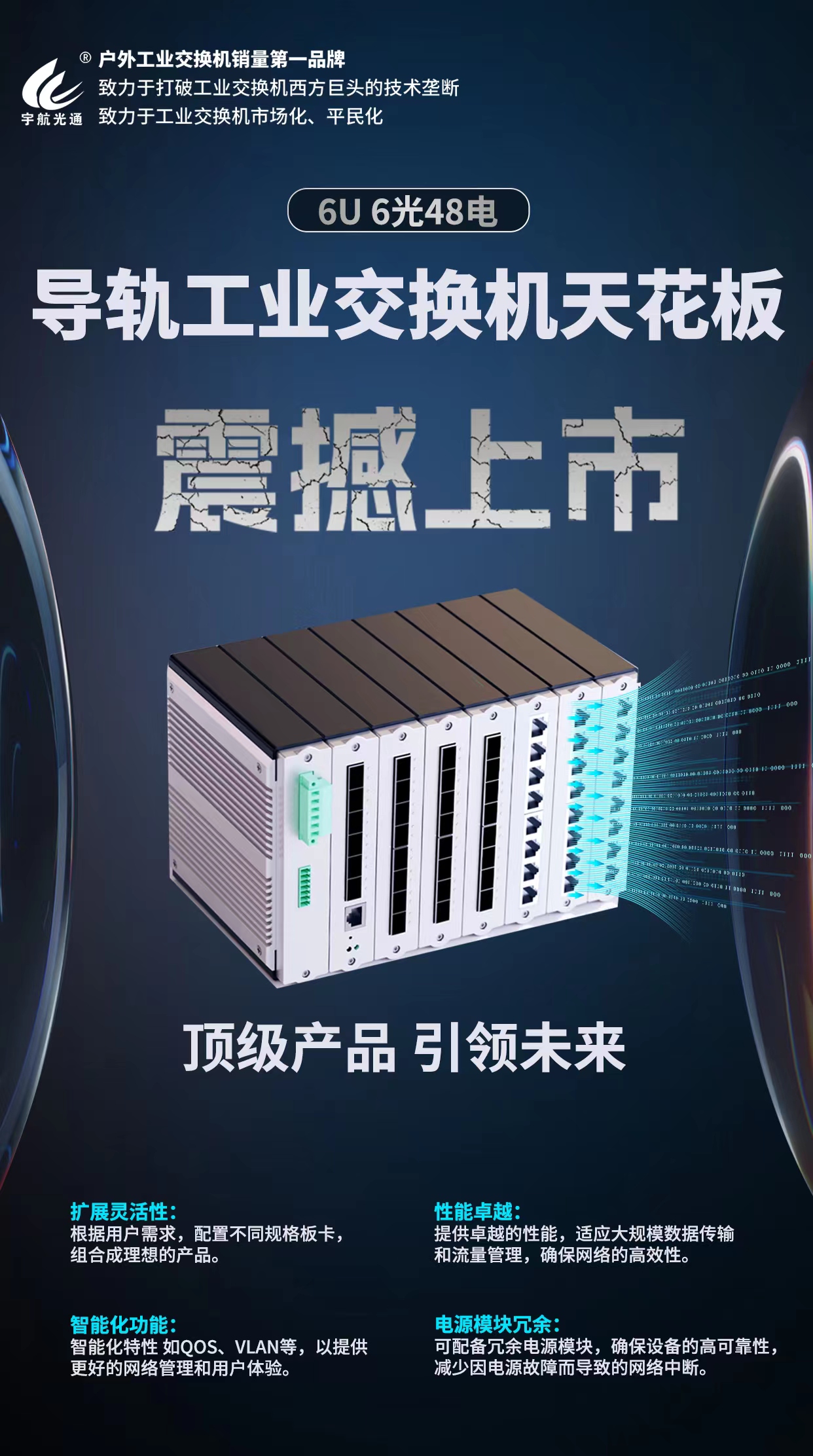 宇航6U-6萬兆48電工業交換機具有6個萬兆光口和48個千兆電口,充分滿足數據中心高性能、高容量、高密度和可拓展的需求。采用高端的交換芯片和頂級的行業器件,實現三層全線速無阻塞交換,確保設備穩定可靠。模塊化設計,用戶可以根據需求配置不同規格的板卡,實現產品的個性化組合。擴展靈活性極高,可以適應大規模的數據傳輸和流量管理,確保網絡的高效運行。小體積大能量,結構緊湊且規格豐富,能夠滿足各種復雜的狹小空間需求。