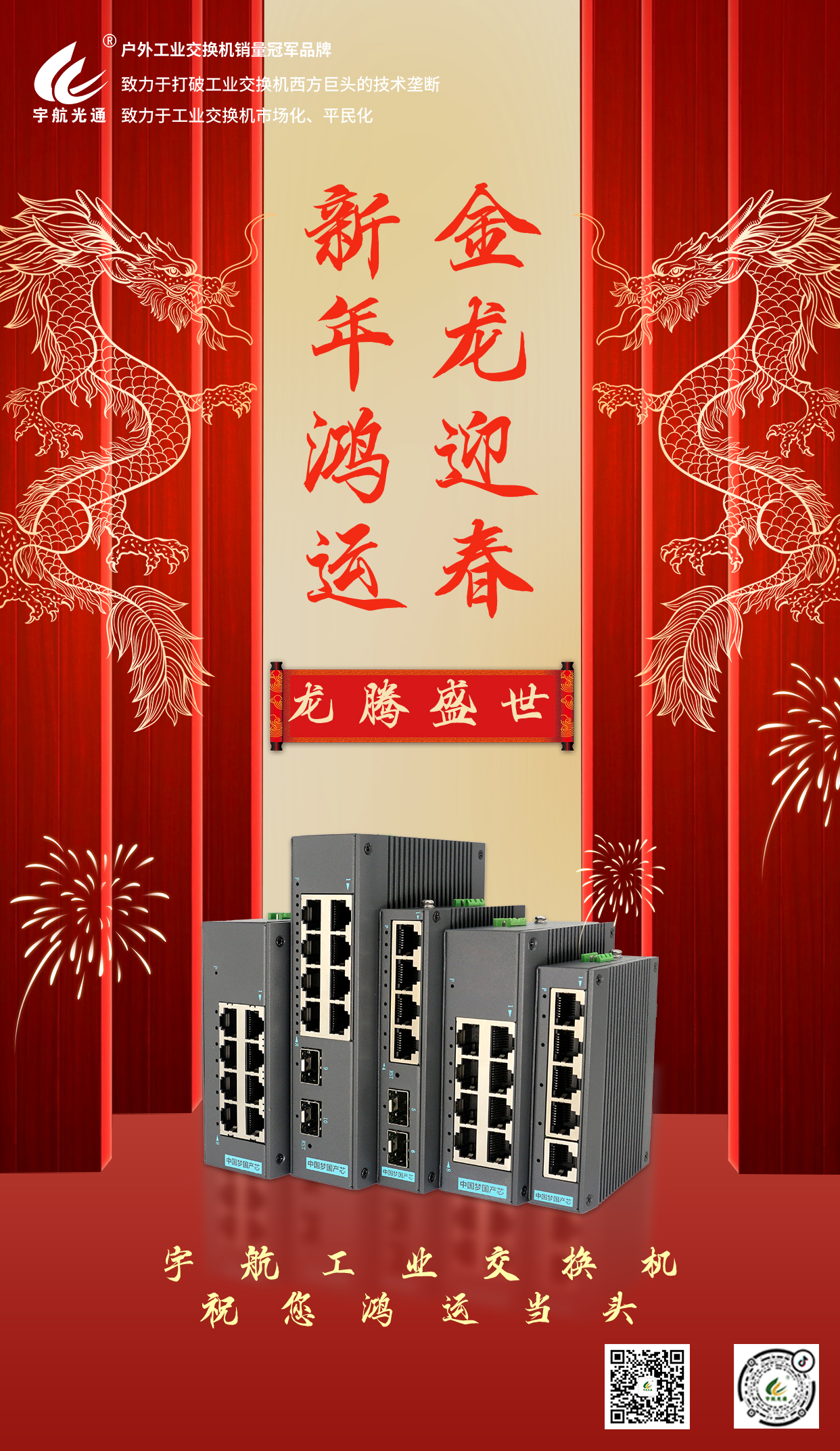 過去的一年,宇航工業交換機在市場的挑戰與機遇中穩步前行,承蒙各位前輩、同行及客戶的關心與支持,宇航取得了一系列令人矚目的成果。感謝大家的信任與陪伴,宇航將繼續保持謙遜與進取的精神,不斷突破自我,在工業交換機領域的技術創新和市場拓展上取得更大的成就。在新的一年里,宇航將持續致力于打破工業交換機西方巨頭的技術壟斷,致力于工業交換機市場化、平民化。