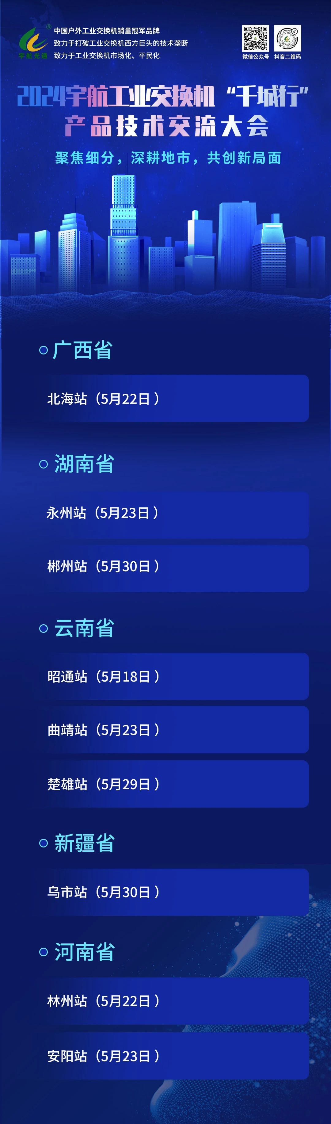 五月中下旬,宇航工業(yè)交換機(jī)繼續(xù)相約與您成都、新疆、山東、北京、湖南(永州、郴州)、廣西北海、云南(昭通、曲靖、楚雄)、河南(林州、安陽(yáng))等地市!期待您的蒞臨!