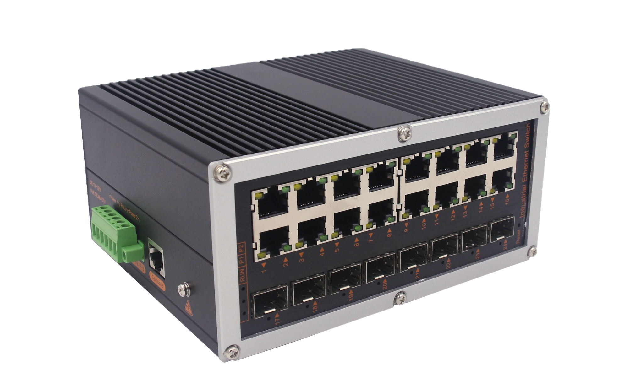 8個千兆光+16個千兆電、SFP接口(不含光模塊)、導軌式、DC12-52V供電