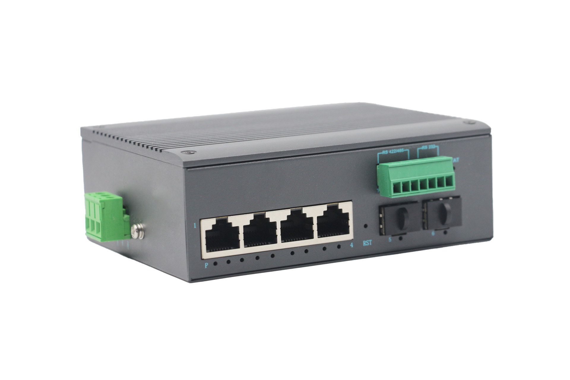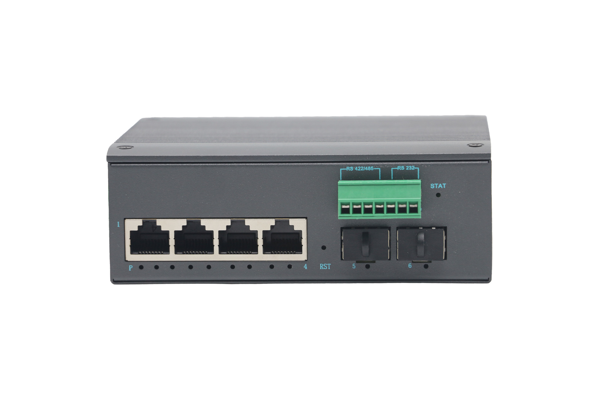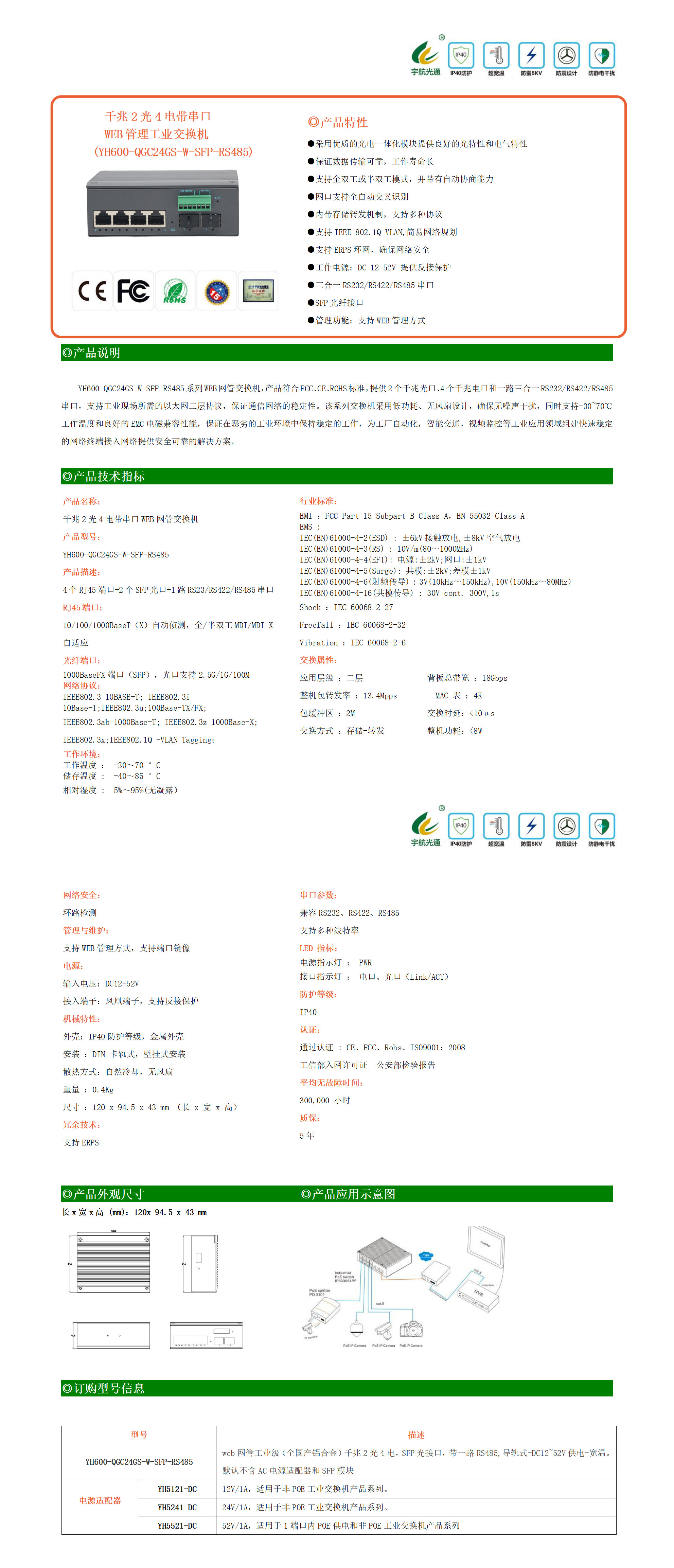 YH600-QGC24GS-W-SFP-RS485系列WEB網(wǎng)管交換機(jī),產(chǎn)品符合FCC、CE、ROHS標(biāo)準(zhǔn),提供2個(gè)千兆光口、4個(gè)千兆電口和一路三合一RS232/RS422/RS485串口,支持工業(yè)現(xiàn)場所需的以太網(wǎng)二層協(xié)議,保證通信網(wǎng)絡(luò)的穩(wěn)定性。該系列交換機(jī)采用低功耗、無風(fēng)扇設(shè)計(jì),確保無噪聲干擾,同時(shí)支持-30~70℃工作溫度和良好的EMC電磁兼容性能,保證在惡劣的工業(yè)環(huán)境中保持穩(wěn)定的工作,為工廠自動化,智能交通,視頻監(jiān)控等工業(yè)應(yīng)用領(lǐng)域組建快速穩(wěn)定的網(wǎng)絡(luò)終端接入網(wǎng)絡(luò)提供安全可靠的解決方案。