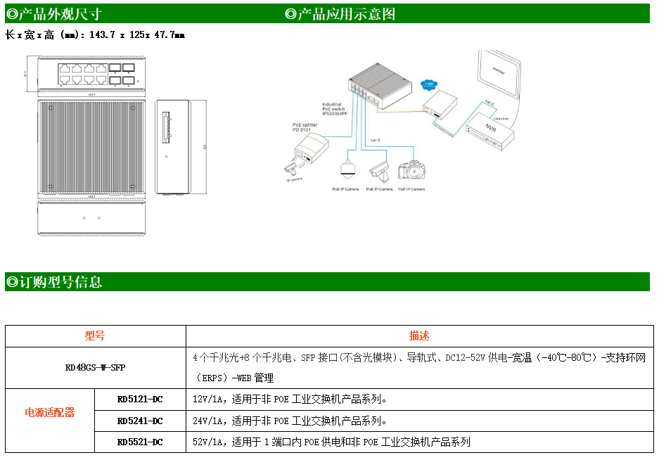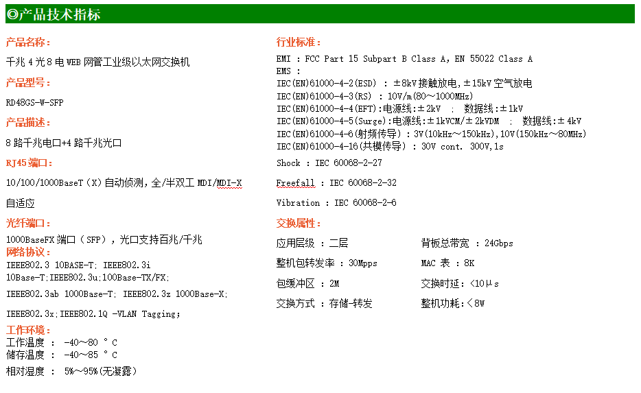 RD48GS-W-SFP系列WEB網(wǎng)管工業(yè)級以太網(wǎng)交換機,產(chǎn)品符合FCC、CE、ROHS標準,支持工業(yè)現(xiàn)場所需的以太網(wǎng)二層協(xié)議,保證通信網(wǎng)絡(luò)的穩(wěn)定性。該系列交換機采用低功耗、無風(fēng)扇設(shè)計,確保無噪聲干擾,同時支持-40~80℃工作溫度和良好的EMC電磁兼容性能,保證在惡劣的工業(yè)環(huán)境中保持穩(wěn)定的工作,為工廠自動化,智能交通,視頻監(jiān)控等工業(yè)應(yīng)用領(lǐng)域組建快速穩(wěn)定的網(wǎng)絡(luò)終端接入網(wǎng)絡(luò)提供安全可靠的解決方案。
