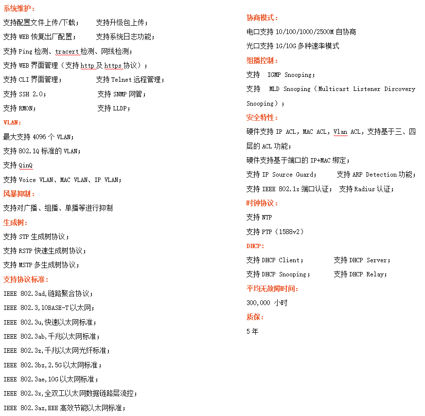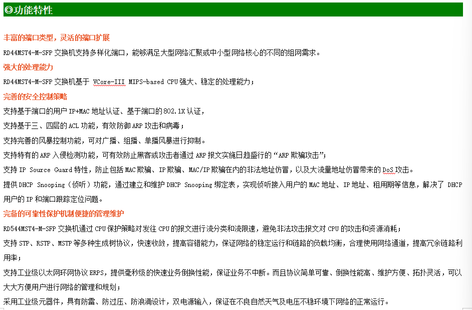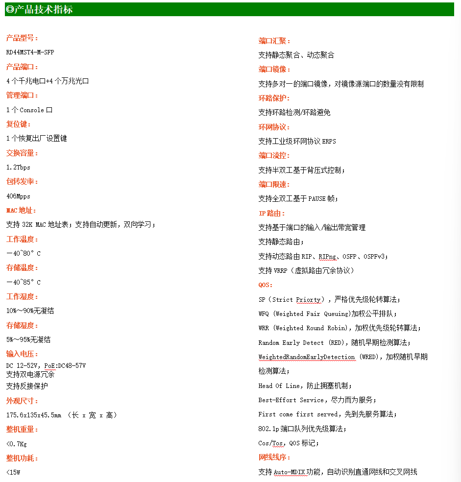 ●網(wǎng)絡(luò)冗余:支持STP/RSTP/MSTP,支持ERPS(自愈時間<20ms)