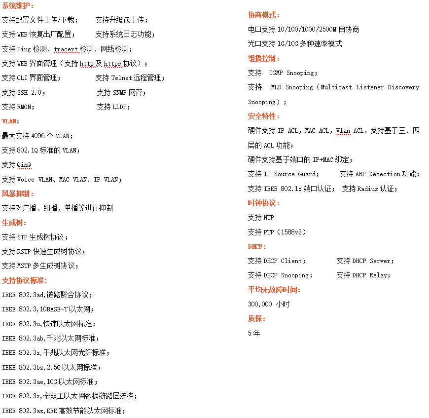 ●網絡冗余:支持STP/RSTP/MSTP,支持ERPS(自愈時間<20ms)