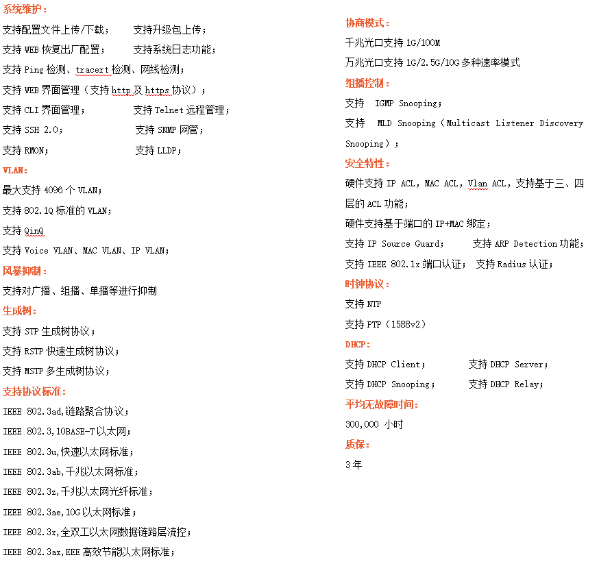 ●網絡冗余:支持STP/RSTP/MSTP,支持ERPS(自愈時間<20ms)