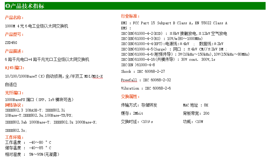 6路千兆電口+4路千兆光口工業級以太網交換機,支持6個10/100/1000Base-T(x)電口和4個1000Base-X光口。產品符合FCC、CE、ROHS標準。RD46G交換機具有-40℃~80℃的工作溫度,具有超強的堅固度能適應各種嚴苛環境,也可以非常方便的安置在空間緊湊的控制箱中。導軌的安裝特性、寬溫操作及擁有IP40防護等級的外殼及LED指示燈,使RD46G成為一個即插即用的工業級設備,為用戶的以太網設備聯網提供可靠、便捷的解決方案。