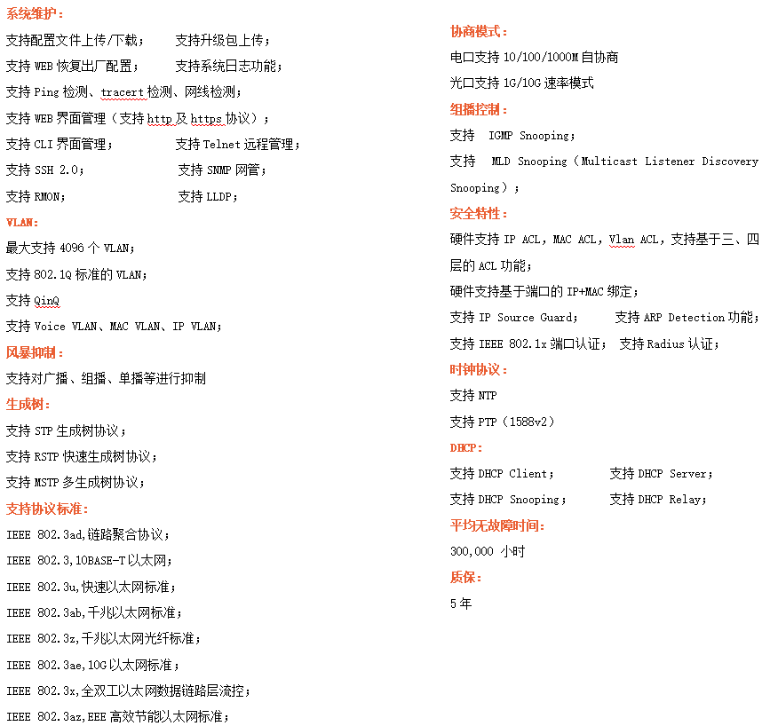 ●網(wǎng)絡(luò)冗余:支持STP/RSTP/MSTP,支持ERPS(自愈時間<20ms)