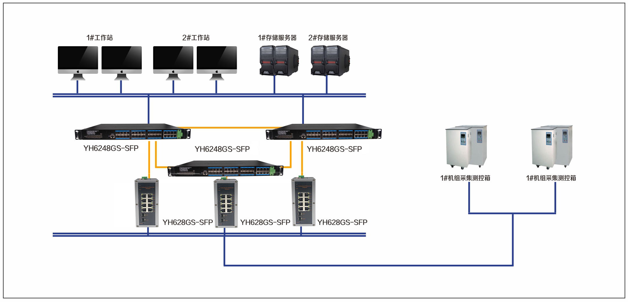 宇航在發(fā)電站集散監(jiān)控系統(tǒng)解決方案中采用了YH6248GS-SFP,YH628GS-SFP.現(xiàn)場數(shù)據(jù)接入層,通過一個(gè)接口轉(zhuǎn)換服務(wù)器在DCS的I/O層上,可將現(xiàn)場數(shù)據(jù)信息映射成DCS的I/O總線上的數(shù)據(jù)信息,使DCS控制統(tǒng)一集成。數(shù)據(jù)通信層采用主控制系統(tǒng)1#2機(jī)組成的冗余環(huán)網(wǎng)信息,上行通過宇航千兆工業(yè)以太網(wǎng)交換機(jī)連接工作站,工程師站以及服務(wù)器等,下行通過千兆以太網(wǎng)交換機(jī)YH628GS連接控制管理主機(jī)站等,實(shí)現(xiàn)整個(gè)系統(tǒng)的冗余結(jié)構(gòu),包裝數(shù)據(jù)傳輸?shù)目煽啃?,穩(wěn)定性。