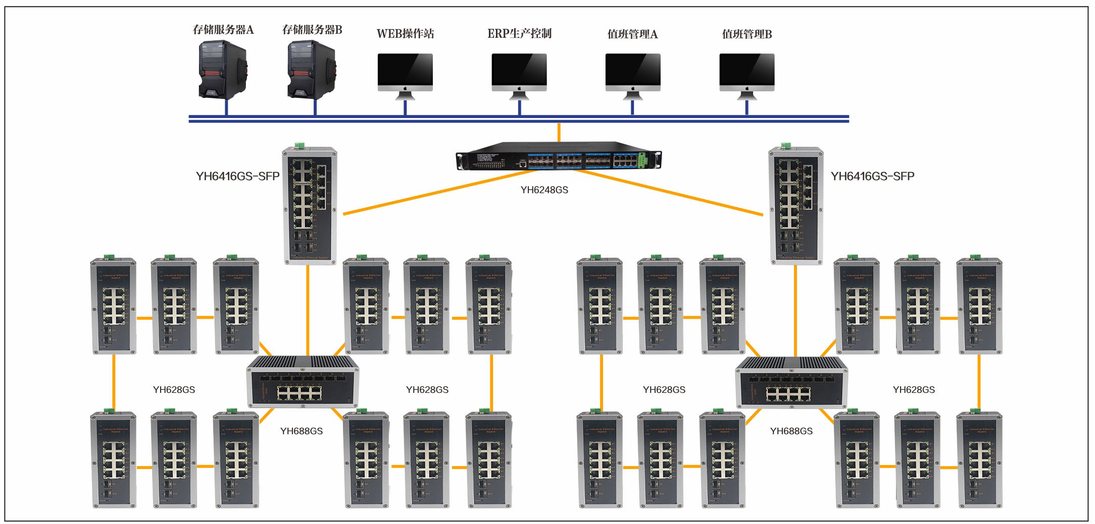 宇航在鋼鐵自動化生產線監控解決方案中采用了YH6248GS-SFP,YH688GS,YH6416GS-SFP工業以太網交換機構筑各個車間內部通信網絡,在車間內部通過YH628GS千兆工業以太網構筑環網,針對實際的站點進行合理的分布,通過虛擬局域網技術對各個車間之間的數據進行邏輯隔離,保證通信的安全性。